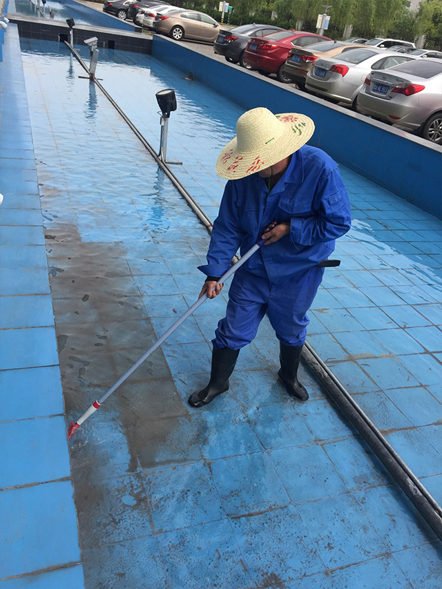 再難再臟的工作我們也要干漂亮!經(jīng)過大家商量討論,排除用機(jī)器磨刷(雖然快但不干凈)的方法,還是采用多花功夫和精力人工鏟除污垢,這樣才能恢復(fù)水池的原樣。5月6日早上兩名專項(xiàng)人員腳穿雨鞋、頭戴草帽,下水池鏟除污垢。鏟刀要成45度角,水泥混雜了水垢后綁在瓷磚上面很結(jié)實(shí),必須用力鏟下去,一寸一寸的啃。手上磨出了水泡、更換了3盒刀片,經(jīng)過4天日曬,終于在5月10日把水池底部的污垢鏟除干凈;謴(fù)了水池碧藍(lán)的本色,我們是水池的美容師!