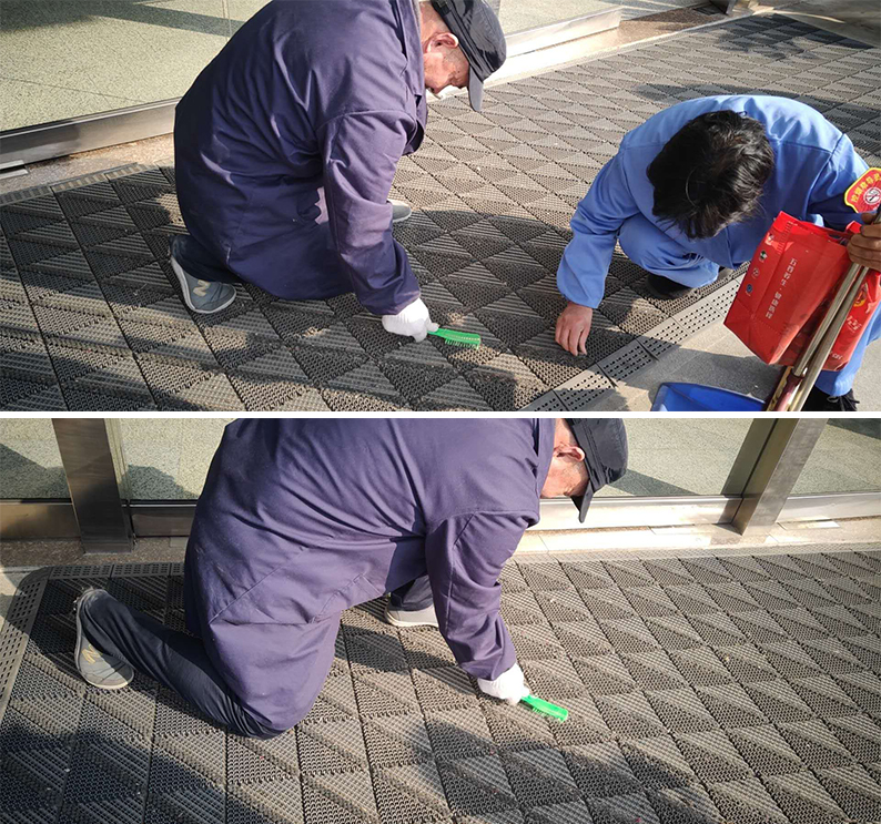 “好醫(yī)管”醫(yī)療事業(yè)部啟東市人民醫(yī)院項目部,5月18日下午,趁著休息天人少,機動師傅計劃把內(nèi)科西門的防滑墊子清潔一下。他拿上保潔工具,叫上大廳里的保潔阿姨,兩個人開始對防滑墊子進行徹底的打掃。他們先把防滑墊子移到臺階上,然后用手拍打墊子,使卡在墊子里的灰塵和臟東西全部掉下來,接著阿姨把地上的臟東西先清理干凈,然后兩個人把防滑墊子拖回原地,由于有些絨毛當(dāng)時不能被拍打下來,所以接下來清理絨毛的任務(wù)只能慢慢地解決了。只見他們用手指一點一點地把絨毛從墊子的夾縫間摳出來,還有些害羞的躲在角落里不肯出來的,王師傅只能動用武力——使用鞋刷把它們?nèi)坷蟻。蹲的時間長了,腿有點酸了,他們就站一會兒,休息了一下又接著干。最后終于把那么一大張的防滑墊子徹底清理干凈了?粗敲锤蓛舻姆阑瑝|子,又看看他們又臟又紅的手,真心的為他們的點贊!